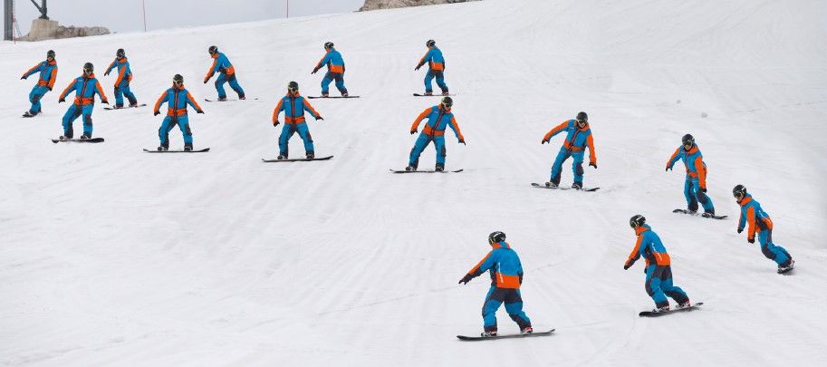 - Schwung zum Hang: Aufbau über den Schwungfächer, um die Angst langsam abzubauen. Hier erfolgt noch kein Kantwechsel! Snowboardlehrer gibt Hilfestellung beim Wegfahren.