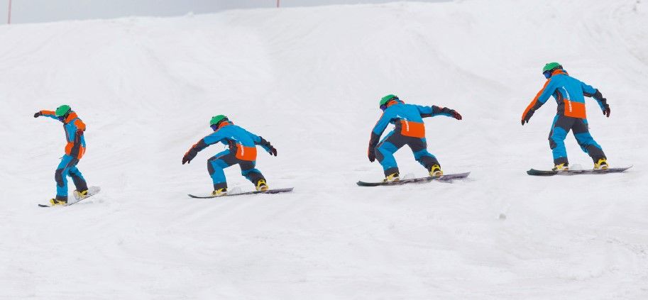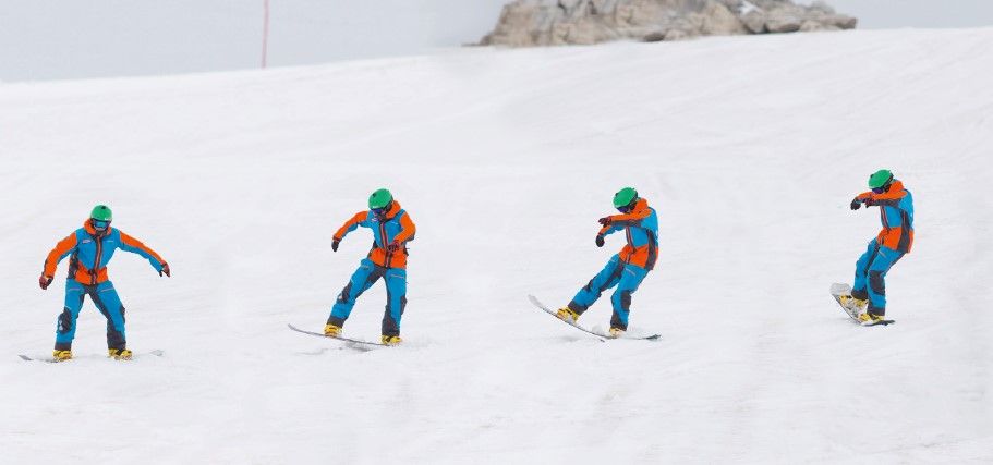 The approach is made through a toeside turn in a low position. The weight is shifted onto the back leg. Then you push off the back leg and shift the weight toward the nose. At the same time, the upper body is rotated forward in the direction of travel. During the rotation, the back leg is pulled in. Afterwards, the tail is set back down and the ride continues on the toeside edge.